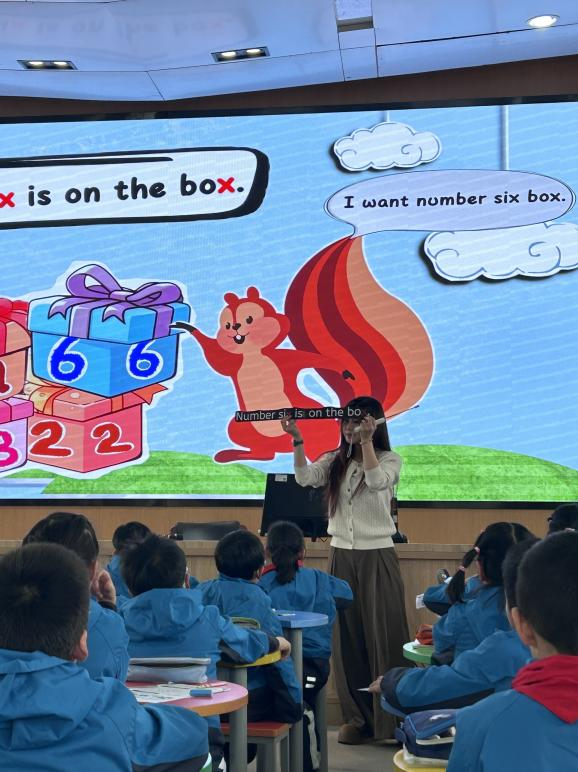 第一节示范课为吴思玥老师执教的三年级上册 Unit6 A Letters and sounds 语音课。课堂伊始,吴老师以字母歌热身,借助教材配套 chant 自然导入,系统传授 “v、w、x、y、z” 五个字母的发音规则。板书环节中,她创新性地运用“小刘海”“大刘海”等形象化表述,清晰阐释字母书写要点,助力学生快速记忆;随后组织学生在作业纸上自主书写并开展自我评价,充分凸显学生的主体地位。课程亮点在于吴老师结合教材经典人物“zip”和“zoom” 创编绘本,将字母、单词与句子融入完整故事语境,极大提升了学习趣味性。同时,她紧扣单元主题情景图,创设“动物学校足球节”的教学背景,课件中的 quiz 环节均围绕 “足球” 主题设计,使学生在猜对答案的过程中直观感知“win”一词的语义;即便在“猜测六号盒子礼物” 的互动环节,也通过“it’s round;you can play”等提示引导学生进行有意义猜测,始终注重语篇的整体性与连贯性,确保每个句子相互关联、形成完整语义链。课程尾声,吴老师利用作业本资源改编 chant,有效巩固了当日所学知识。